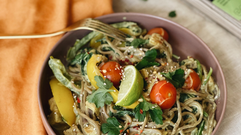 Kokos kerrie noodles met tempeh Deze soba noodles met tempeh in kokos kerriesaus zijn een fijne keuze voor wie een snelle, voedzame maaltijd op tafel…